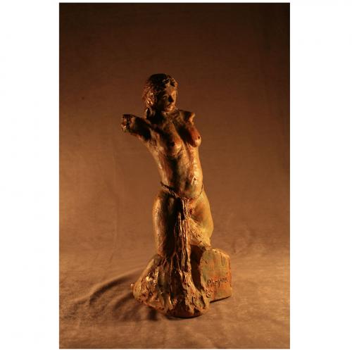 Courtisane à Athènes au IVe   siècle av. J.C. D’une grande  beauté, elle devient le modèle et l’amante du sculpteur Praxytèle. Ses tarifs étant fort élevés, elle accumule une telle richesse qu’elle aurait offert de rebâtir les murailles de Thèbes.